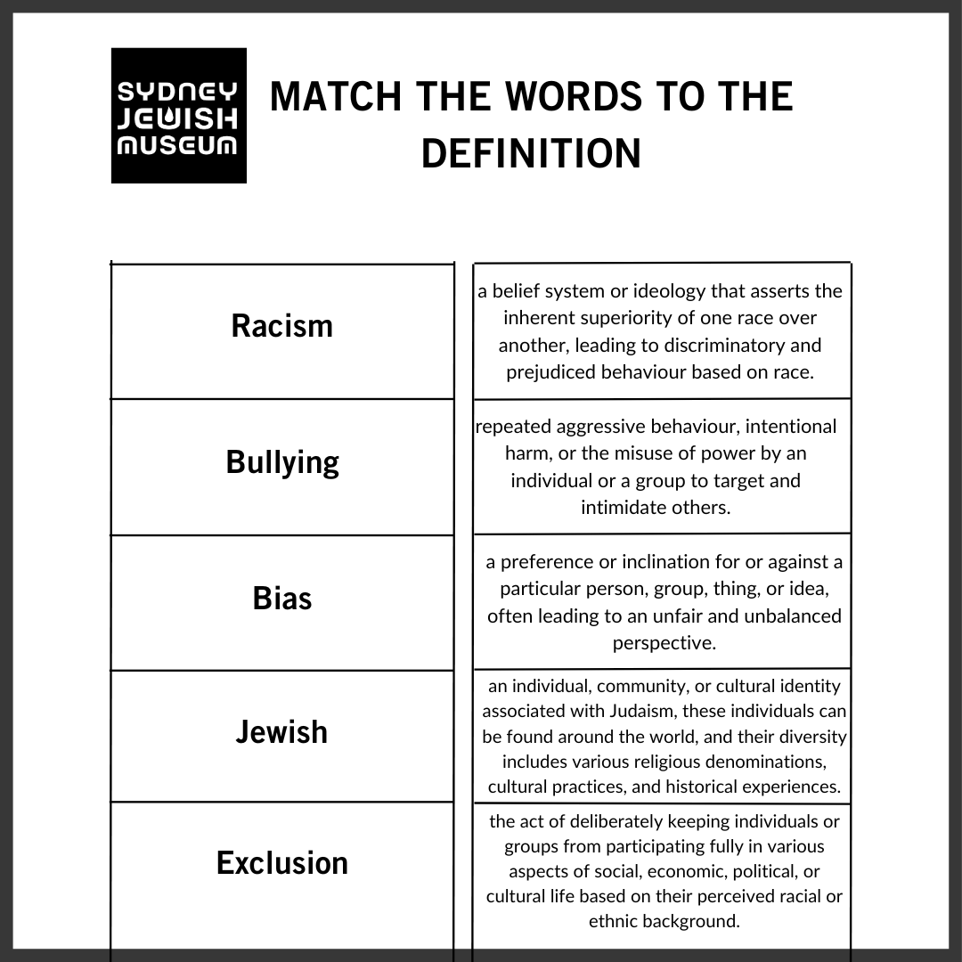 This activity helps students understand key concepts related to discrimination, prejudice, and social dynamics by matching terms to their definitions. It aims to clarify important terms like racism, antisemitism, bullying, and prejudice, fostering a deeper understanding of these issues. Through this, students can recognise and reflect on various forms of discriminatory behaviour and the importance of standing up against it, while promoting empathy, awareness, and inclusivity.
