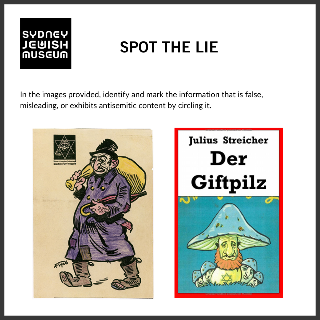 This activity encourages students to critically examine images for false, misleading, or antisemitic content. By identifying and marking inaccuracies or harmful messages, students develop media literacy skills and gain a better understanding of how antisemitism and other forms of discrimination can manifest in visual content. It promotes critical thinking and awareness of bias and misinformation.
