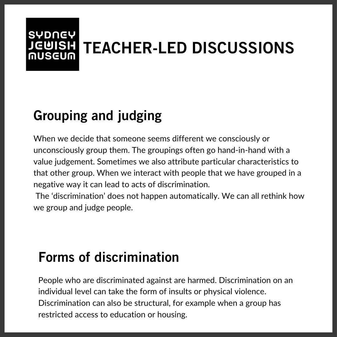 These Teacher-led discussions focus on understanding how we group and judge people, which can lead to discrimination. Discrimination can take personal or structural forms, harming individuals or communities. Specifically, antisemitism is a form of discrimination targeting Jewish people based on negative stereotypes or prejudice. The key message is to rethink how we judge others and promote respect and kindness towards everyone, regardless of their background or beliefs.