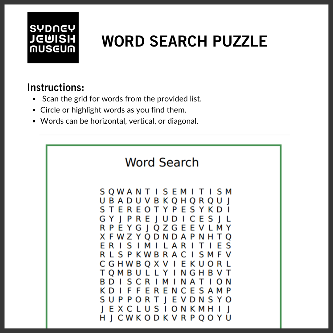 The purpose of the word search puzzle activity is to reinforce students’ familiarity with key vocabulary related to a specific topic (such as discrimination, prejudice, or inclusivity) in a fun and engaging way. By searching for and identifying words, students improve their focus, attention to detail, and recall of important terms, while indirectly reinforcing their understanding of the concepts these words represent.